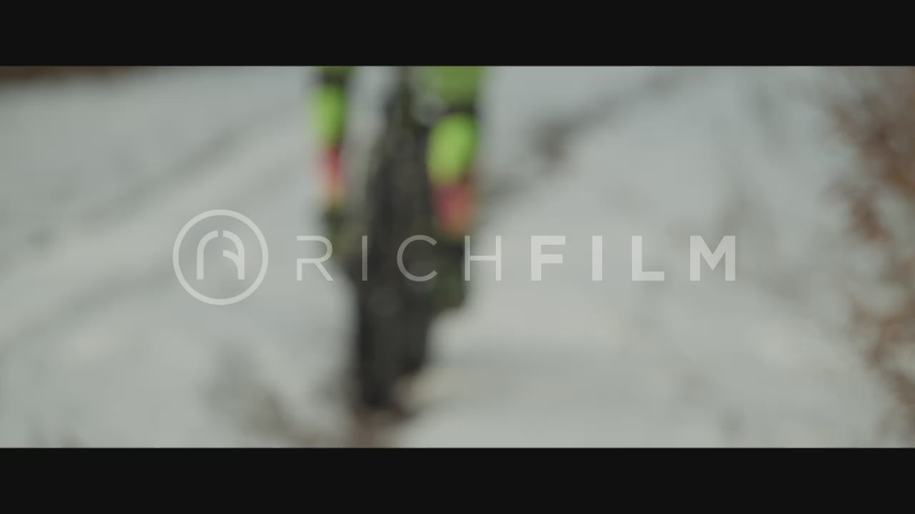 Slow motion shot of a mountain biker riding through a snow-covered forest